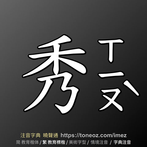 秀,注音ㄒㄧㄡˋ,拼音xiù,辭典解釋為:1.稻麥等穀類所吐的穗或草木所開的花。例:麥秀、蘭秀 2.優異、傑出。例:優秀、秀士、秀才 3.才智傑出的人。例:後起之秀 4.清麗、俊美。例:娟秀、清秀、山明水秀 5.表演、展現。§英show例:做秀、歌舞秀、秀球技