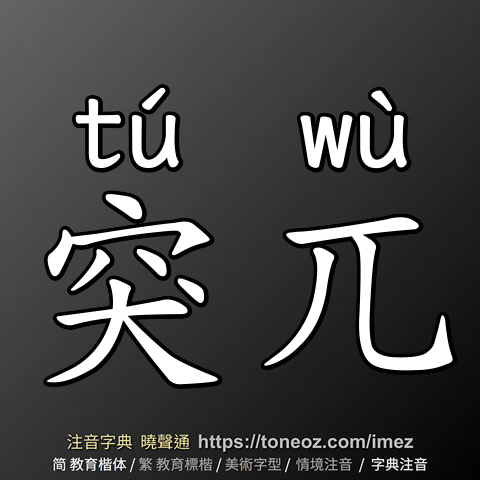 突兀,注音ㄊㄨˊ ㄨˋ,拼音tú wù,辭典解釋為:1.高聳的樣子。例:山勢突兀 2.唐突意外。例:你沒有事先通知就直接去拜訪長官,這樣未免太突兀了。