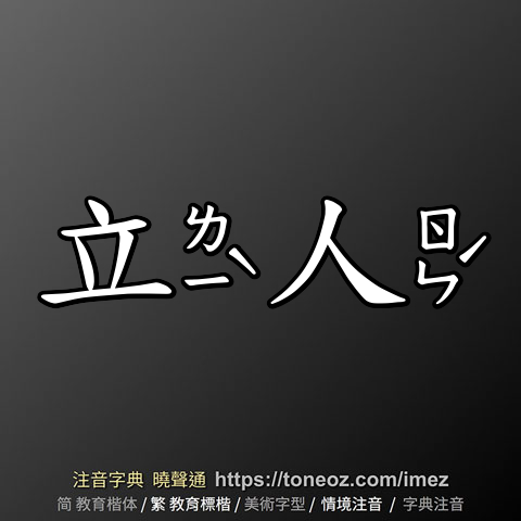 立人,注音ㄌㄧˋ ㄖㄣˊ,拼音lì rén,辭典解釋為:1.為人、做人。例:謙和是處世之本,誠信為立人之基。 2.輔助別人使之自立。例:己立立人,己達達人。 3.指當偏旁的人字。例:「信」字的偏旁是「立人」。