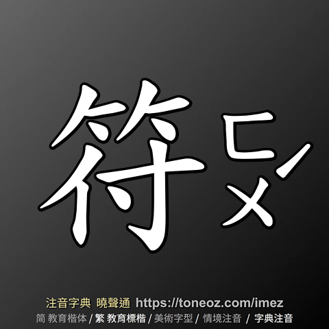 符,注音ㄈㄨˊ,拼音fú,辭典解釋為:1.古代用為憑信的器物,刻字在竹、木、金、玉、銅等材料上,對剖為半,各執其一, 驗時以兩方相合為徵信。例:虎符、兵符、符合 2.相合、吻合。例:名實相符 3.祥瑞的徵兆。例:祥符 4.標記、記號。例:音符、符號 5.一種道士用來避邪、驅使鬼神的神祕道具。例:安胎符、鎮宅符 6.姓。