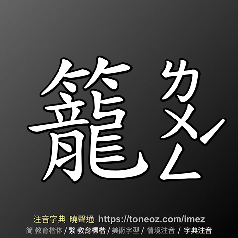 籠,注音ㄌㄨㄥˊ,拼音lóng,辭典解釋為:1.用來盛裝或覆蓋東西的竹編器具。例:燈籠、蒸籠、竹籠 2.用來拘囚人或鳥獸的器具。例:鳥籠、牢籠、囚籠 3.包羅、囊括。例:籠統、籠括 4.遮住、覆蓋。例:籠罩、籠蓋