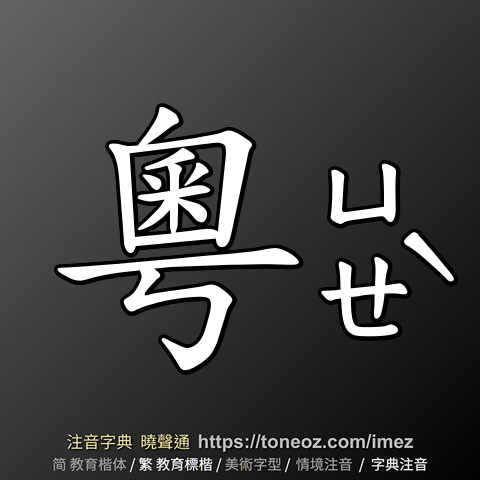 粵,注音ㄩㄝˋ,拼音yuè,辭典解釋為:廣東省的簡稱。例:粵語、粵劇