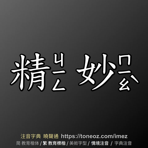 精妙,注音ㄐㄧㄥ ㄇㄧㄠˋ,拼音jīng miào,辭典解釋為:精緻巧妙。例:刺繡是中國一項精妙的傳統工藝。