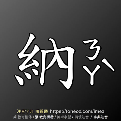 納,注音ㄋㄚˋ,拼音nà,辭典解釋為:1.收、容、受。例:接納、笑納、採納 2.交、獻。例:納稅、繳納 3.娶。例:納妾