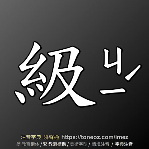 級,注音ㄐㄧˊ,拼音jí,辭典解釋為:1.等第。例:高級、特級、輔導級 2.學校按年齡所分的班次。例:一年級、高年級 3.臺階。例:石級、階級、拾級而上 4.量詞:(1) 計算臺階、樓梯、塔層等的單位。例:百級石階 (2) 計算事物分級的單位。例:地震強度分為七級。