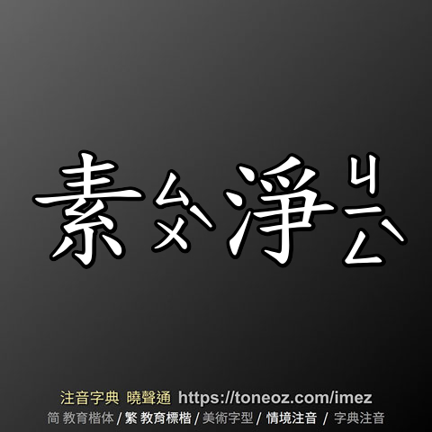 素淨,注音ㄙㄨˋ ㄐㄧㄥˋ,拼音sù jìng,辭典解釋為:顏色或裝飾樸素不濃豔。例:那女孩有張素淨的臉龐,出奇的秀氣,頗惹人憐愛。