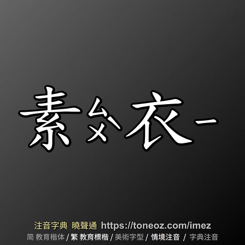 素衣,注音ㄙㄨˋ ㄧ,拼音sù yī,辭典解釋為:1.白衣,古用為中衣。《詩經.唐風.揚之水》:「素衣朱襮,從子于沃。」 2.喪葬時所服的白衣。《三國演義》第一○五回:「禮畢,只見左右人皆著素衣。」