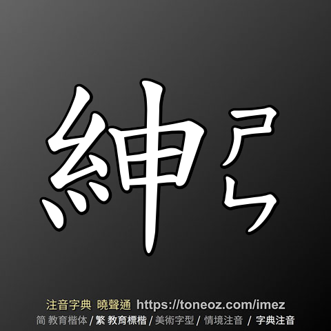 紳,注音ㄕㄣ,拼音shēn,辭典解釋為:1.古代官員束在腰間而下垂的大帶子。例:子張書諸紳。(《論語.衛靈公》) 2.地方上有身分地位的人。例:富紳、鄉紳、土豪劣紳