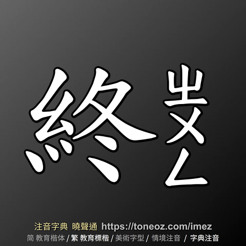 終,注音ㄓㄨㄥ,拼音zhōng,辭典解釋為:1.時間處於最後的、結束的部分。指事情的末端。與「始」相對。例:年終、終點、有始有終 2.從開始到末了一整段時間的。例:終年、終日、終生 3.結束、完畢。例:曲終人散、樂曲終了 4.死亡。例:送終、善終、無疾而終 5.到底、畢竟。例:終究、終將結束