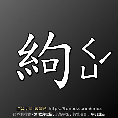 絇,注音ㄑㄩˊ,拼音qú,辭典解釋為:[名] 1.用布縷絲麻搓編成的繩索。唐.皇甫湜〈諭業〉:「淺闢庸種無嘉苗,頹絇疏織無良帛。」 2.古代鞋頭的裝飾品。《禮記.檀弓上》:「繩屨無絇。」 3.姓。如宋代有絇紡。