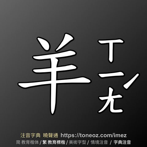 羊,注音ㄧㄤˊ,拼音yáng,辭典解釋為:1.泛稱哺乳綱偶蹄目牛科部分動物。如綿羊、山羊、羚羊等。皮、毛、角、骨都具利用價值,肉、乳可供人食用。 2.姓。