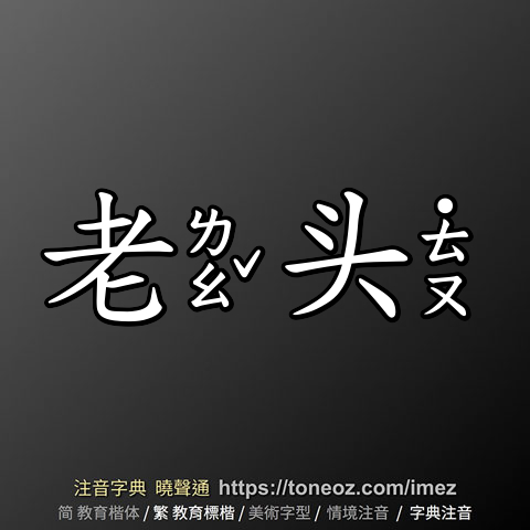 辭典解釋為:老,1.年紀大的。與「少」相對。例:年老、老兵、老人 2.對長輩的尊稱。例:劉老、于老、國之大老 3.熟練、經驗豐富。例:老手、老練、老江湖 4.陳舊的。例:老式、老套、老交情 5.原來的。例:老家、老地方、老規矩 6.總是、常常。例:凡事想想自己,別老挑人毛病。 7.很、極。例:老遠、老早 8.加在稱呼、姓氏上,表示尊敬或親暱。例:老師、老闆、老李 9.詞綴。加在動物名稱上。例:老虎、老鼠 10. 老子及其哲學的簡稱。例:老莊、黃老之術...