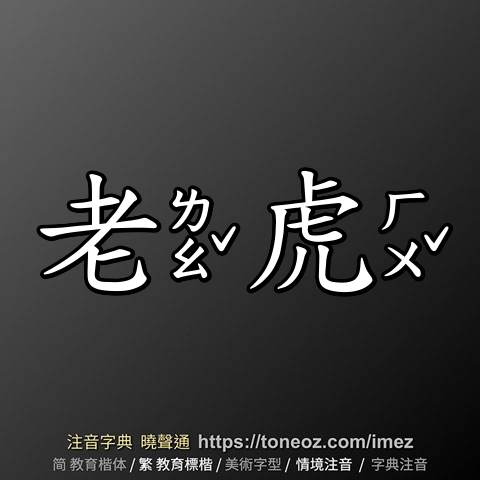 老虎,注音ㄌㄠˇ ㄏㄨˇ,拼音lǎo hǔ,辭典解釋為:→虎1.