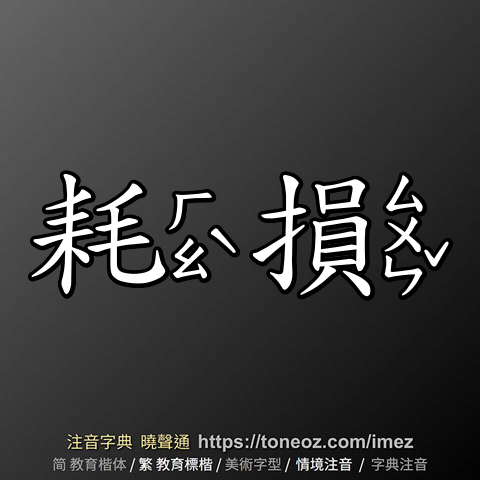 耗損,注音ㄏㄠˋ ㄙㄨㄣˇ,拼音hào sǔn,辭典解釋為:消耗減損。例:這個零件已經耗損過度,該換新的了。