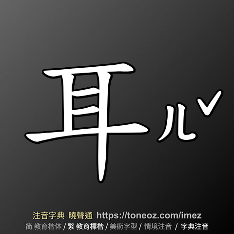 耳,注音ㄦˇ,拼音ěr,辭典解釋為:1.脊椎動物的聽覺器官與平衡器官。分外耳、中耳、內耳。例:牛耳、如雷貫耳  2.器物兩旁所附似耳的把手。例:鼎耳 3.形狀像耳朵的東西。例:木耳、銀耳 4.助詞。相當於「而已」、「罷了」。例:想當然耳。