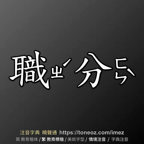 職分,注音ㄓˊ ㄈㄣˋ,拼音zhí fèn,辭典解釋為:職務上應盡的本分。《文選.諸葛亮.出師表》:「此臣之所以報先帝,而忠陛下之職分也。」