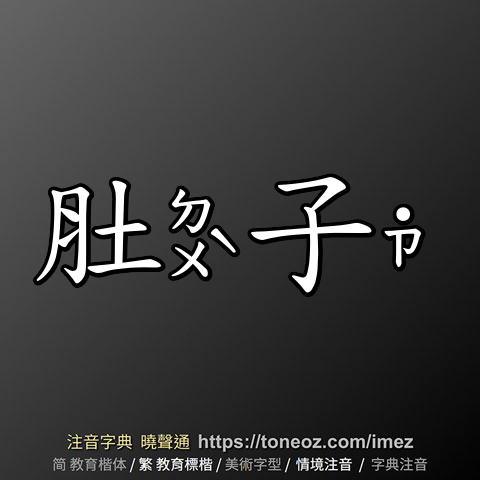 肚子,注音ㄉㄨˋ ˙ㄗ,拼音dù zi,辭典解釋為:1.腹部的通稱。例:他因為吃了不乾淨的東西,現在肚子正疼著呢! 2.物體中圓而凸起像肚子的部分。例:這隻酒瓶有個胖胖的肚子,看起來特別可愛。