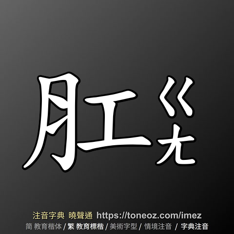 肛,注音ㄍㄤ,拼音gāng,辭典解釋為:→肛門