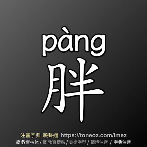 胖,注音ㄆㄤˋ,拼音pàng,辭典解釋為:體態豐滿、脂肪多。與「瘦」相對。例:肥胖、胖娃兒