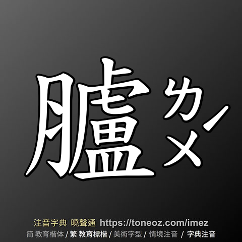 臚,注音ㄌㄨˊ,拼音lú,辭典解釋為:1.陳列。例:臚列 2.流傳的、傳述的。例:臚傳、臚唱
