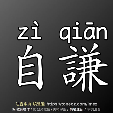 自謙,注音ㄗˋ ㄑㄧㄢ,拼音zì qiān,辭典解釋為:謙抑自處而不誇耀。例:雖然眾望所歸,他卻自謙能力不足而推掉了。