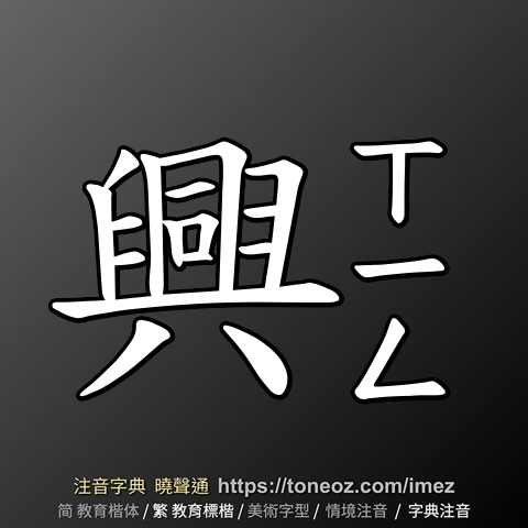 興,注音ㄒㄧㄥ,拼音xīng,辭典解釋為:1.事情的發生或出現。例:興起 2.發動。例:興師問罪 3.創立、建造。例:興辦、興建、興學 4.流行、盛行。例:時興 5.起來、起身。例:夙興夜寐 6.昌盛、旺盛。與「衰」相對。例:興隆、興盛