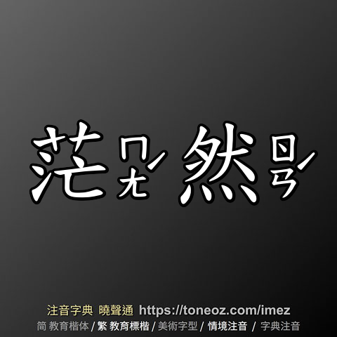 茫然,注音ㄇㄤˊ ㄖㄢˊ,拼音máng rán,辭典解釋為:1.不知所措的樣子。例:突然得知這個惡耗,他的腦海中頓時一片茫然,不知如何處理。 2.悵惘若有所失的樣子。例:當他知道自己鑄成大錯,頓時茫然自失。