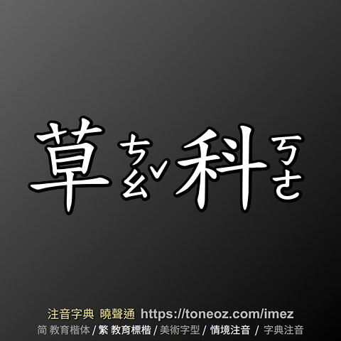 草科,注音ㄘㄠˇ ㄎㄜ,拼音cǎo kē,辭典解釋為:草窠。《西遊記》第一五回:「鬥不數合,小龍委實難搪,將身一幌,變作一條水蛇兒,鑽入草科中去了。」
