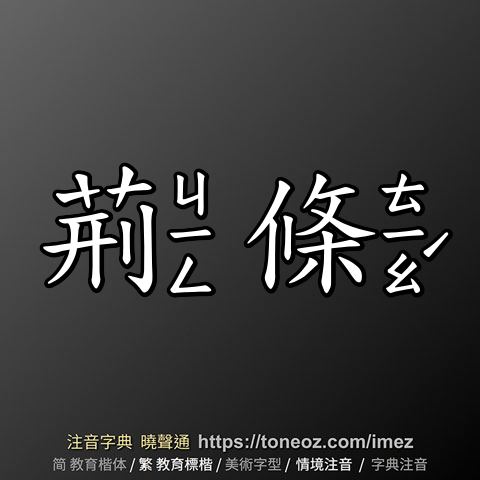 荊條,注音ㄐㄧㄥ ㄊㄧㄠˊ,拼音jīng tiáo,辭典解釋為:荊木的枝條。可以編製筐籃等器具,古代也用為刑具。《福惠全書.卷一二.刑名部.問擬》:「不用荊條,徒流按年里起發。」