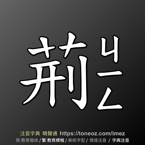 荊,注音ㄐㄧㄥ,拼音jīng,辭典解釋為:1.植物名。落葉灌木。枝條可編籃筐,古人亦用作刑杖。種類繁多,有牡荊、紫荊、黃荊等多種。例:荊棘 2.舊時對人謙稱自己的妻子。例:拙荊、寒荊 3.姓。 4.→荊州