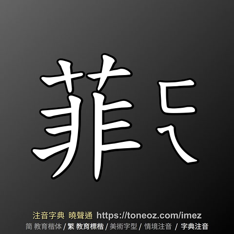 菲,注音ㄈㄟˇ,拼音fěi,辭典解釋為:微薄的。例:菲薄、菲酌、價值不菲