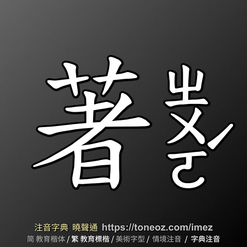 著,注音ㄓㄨㄛˊ,拼音zhuó,辭典解釋為:1.穿上。例:著衣、穿著 2.到達、接觸。例:著陸、不著邊際 3.依附,使依附。例:著色、著墨 4.命令、差使。例:著人前來 5.下棋行子。例:棋高一著