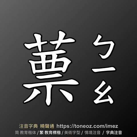 蔈,注音ㄅㄧㄠ,拼音biāo,辭典解釋為:[名] 1.開黃色花朵的凌霄花。《爾雅.釋草》:「苕,陵苕。黃華,蔈;白華,茇。」宋.邢昺.疏:「苕,一名陵苕。……黃花名蔈,白華名茇,別華色之名也。」 2.無根的水中草。通「薸」。《淮南子.墬形》:「容華生蔈,蔈生萍藻,萍藻生浮草。」