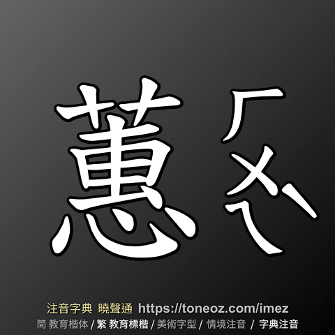 蕙,注音ㄏㄨㄟˋ,拼音huì,辭典解釋為:1.一種香草。古人將其佩帶在身上以避疫癘。 △佩蘭 2.比喻性情高雅、高潔。例:蕙質蘭心