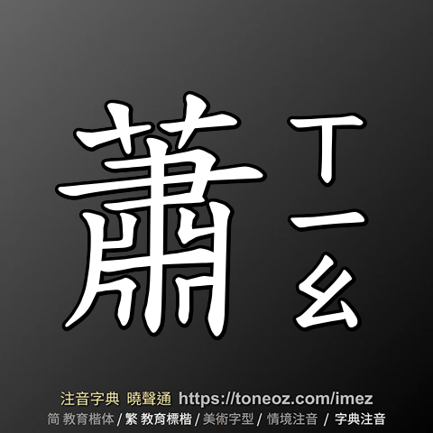 蕭,注音ㄒㄧㄠ,拼音xiāo,辭典解釋為:1.寂寥、冷清。例:蕭條、蕭瑟、蕭索 2.狀聲詞。形容馬鳴聲、風聲或落葉聲。例:蕭蕭 3.姓。