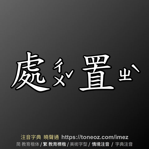 處置,注音ㄔㄨˇ ㄓˋ,拼音chǔ zhì,辭典解釋為:1.處理、措置。例:這件事經他適當的處置後,終於化險為夷了。 2.處罰、懲治。例:等到塵埃落定後,再來處置他也不遲。