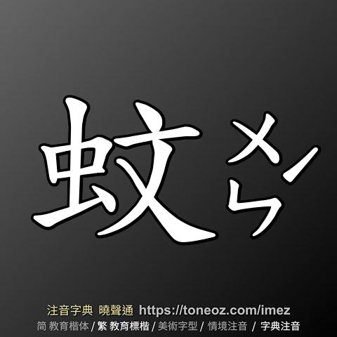 蚊,注音ㄨㄣˊ,拼音wén,辭典解釋為:動物名。雙翅目蚊科。形體細長,胸部有一對翅膀和三對細長的腳。雄蚊主食花蜜和植物汁液,雌蚊則多數以人畜的血液為食。卵產於水面,孵化為水生幼蟲孑孓,後蛻化為蛹,再變為成蟲。能傳染黃熱病、瘧疾、絲蟲病和登革熱。 △白鳥、豹腳、蚊蟲、蚊子