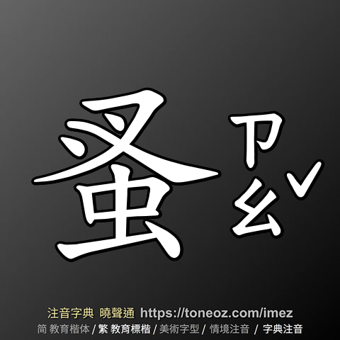 蚤,注音ㄗㄠˇ,拼音zǎo,辭典解釋為:1.隱翅目昆蟲的總稱。約一千六百多種。頭小體肥,無翅,腳上有棘刺,後腳發達,善跳躍。寄生於人、貓及鼠等動物身上,以吸食血液為生。 △跳蚤 2.早晨。通「早」。例:蚤起,施從良人之所之。(《孟子.離婁下》)