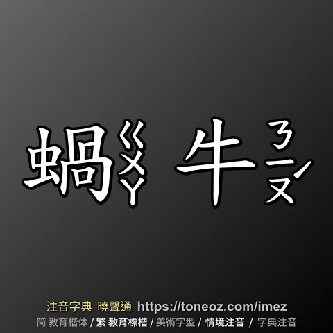 蝸牛,注音ㄍㄨㄚ ㄋㄧㄡˊ,拼音guā niú,辭典解釋為:動物名。軟體動物門腹足綱。為一種有肺的軟體動物,外殼扁圓。頭有四個觸角,其中一對較長。尖端有眼,用腹足蠕動前進。雌雄同體,對農作物有害。例:蝸牛走過的地方,會留下一道白色透明的黏液。 △篆愁君、水牛兒