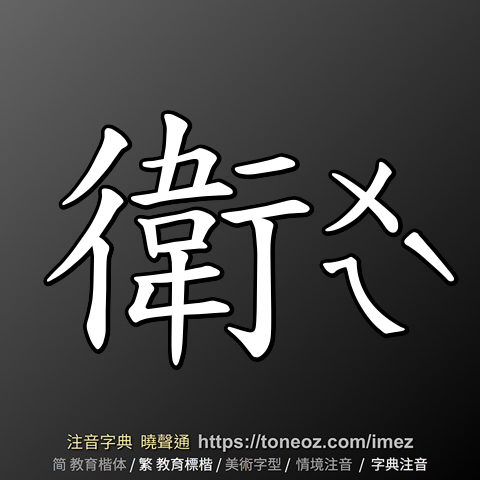 衛,注音ㄨㄟˋ,拼音wèi,辭典解釋為:1.保護、防守。例:防衛、自衛、守衛 2.擔任防護工作的人。例:侍衛、警衛 3.古國名。周朝分封的姬姓諸侯國,故址約在今河北省南部和河南省北部一帶,後為秦所滅。 4.姓。
