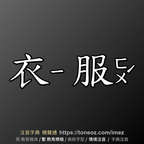 衣服,注音ㄧ ㄈㄨˊ,拼音yī fú,辭典解釋為:泛指可以穿著的各種衣裳、服裝。例:母親將家裡的一些舊衣服捐給孤兒院。
