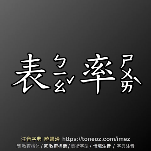 表率,注音ㄅㄧㄠˇ ㄕㄨㄞˋ,拼音biǎo shuài,辭典解釋為:模範、榜樣。例:他的孝行足可作為眾人的表率。