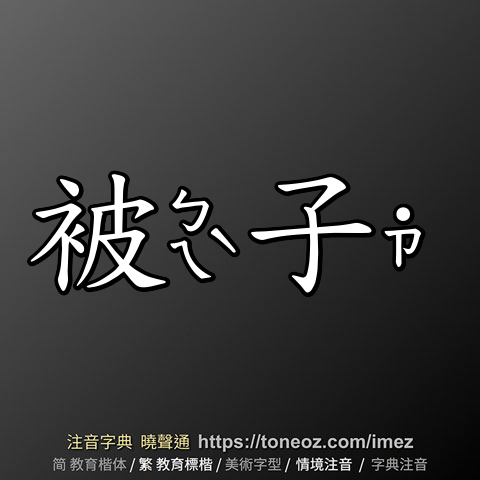 被子,注音ㄅㄟˋ ˙ㄗ,拼音bèi zi,辭典解釋為:睡覺時蓋在身上的寢具。一般以棉絮縫在布內,外加被套。也稱為「棉被」。