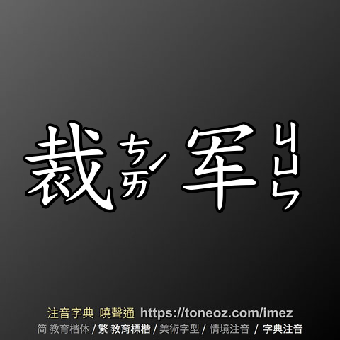 辭典解釋為:裁,1.用刀、剪等把紙或布割裂、剪開。例:剪裁、裁布、裁紙 2.削減。例:裁軍、裁員 3.衡量、判斷。例:裁判、裁奪、裁量 4.安排取捨。例:別出心裁 5.控制。例:獨裁 6.殺。例:自裁 7.體制、格式。例:體裁...
