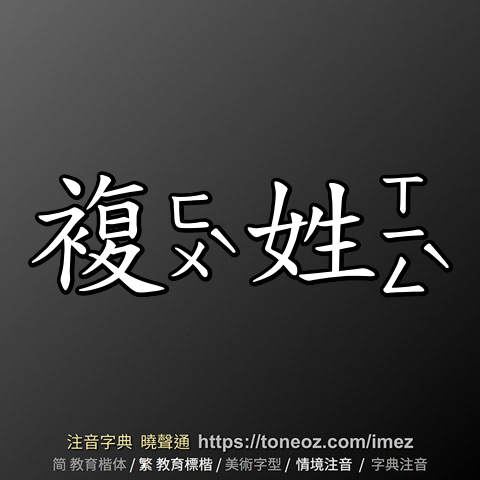 複姓,注音ㄈㄨˋ ㄒㄧㄥˋ,拼音fù xìng,辭典解釋為:由二字或二字以上結合而成的姓。如「諸葛」、「司馬」、「司徒」、「歐陽」等。 △覆姓