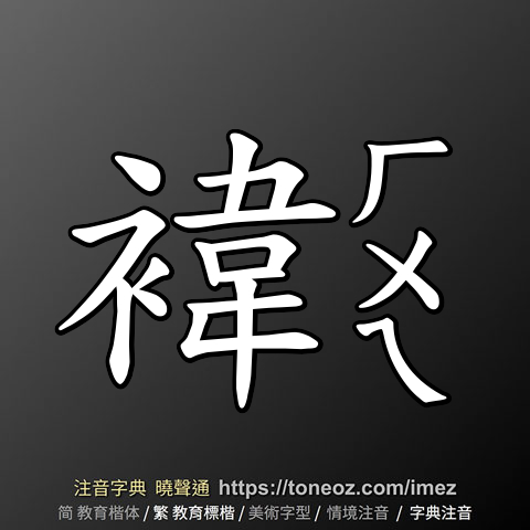 褘,注音ㄏㄨㄟ,拼音huī,辭典解釋為:[名] 1.用以遮蔽膝前或覆蓋額頭的方巾。唐.皮日休〈九諷系述.悲遊〉:「荷為裯兮芰為襬,荃為䘿兮薜為褘。」 2.王后的祭服,上面畫有五彩的雉雞圖案。《周禮.天官.內司服》:「掌王后之六服:褘衣、揄狄、闕狄、鞠衣、展衣、緣衣。」漢.鄭玄.注:「褘衣,畫翬者。……從王祭先王則服褘衣。」
