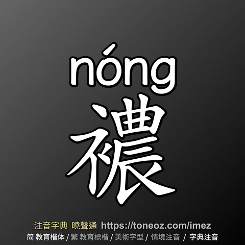 襛,注音ㄋㄨㄥˊ,拼音nóng,辭典解釋為:[形] 1.衣服厚重的樣子。《說文解字.衣部》:「襛,衣厚貌。」 2.美盛。如:「襛華」。《詩經.召南.何彼襛矣》:「何彼襛矣,唐棣之華。」 3.肥胖、豐滿。《文選.曹植.洛神賦》:「襛纖得衷,脩短合度。」
