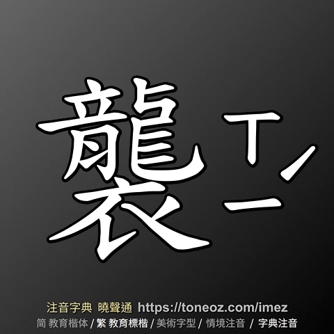 襲,注音ㄒㄧˊ,拼音xí,辭典解釋為:1.依循原有的而不改變。例:沿襲、因襲 2.繼承、接受。例:世襲、襲爵 3.乘人不備而攻擊。例:偷襲、侵襲、襲擊 4.觸及、撲向。例:春風襲面、涼意襲人 5.量詞。計算成套的衣服或被褥的單位。例:一襲灰衣