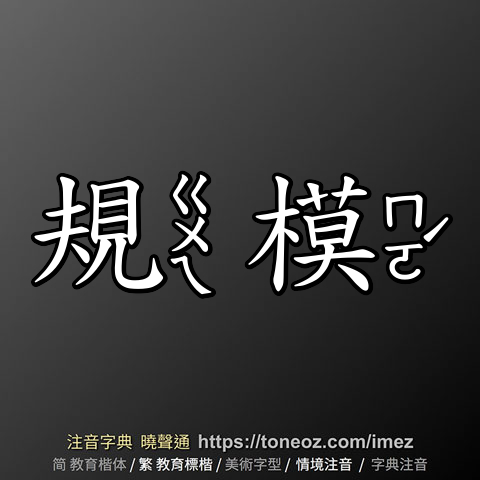 規模,注音ㄍㄨㄟ ㄇㄛˊ,拼音guī mó,辭典解釋為:形式、格局。例:這家商店經過店主一年來的努力經營,已經頗具規模了。