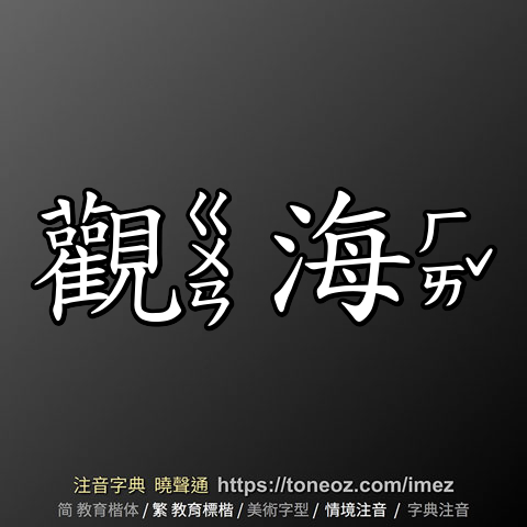 觀海,注音ㄍㄨㄢ ㄏㄞˇ,拼音guān hǎi,辭典解釋為:比喻視野或見識廣大。語本《孟子.盡心上》:「孔子登東山而小魯,登太山而小天下,故觀於海者難為水,遊於聖人之門者,難為言。」